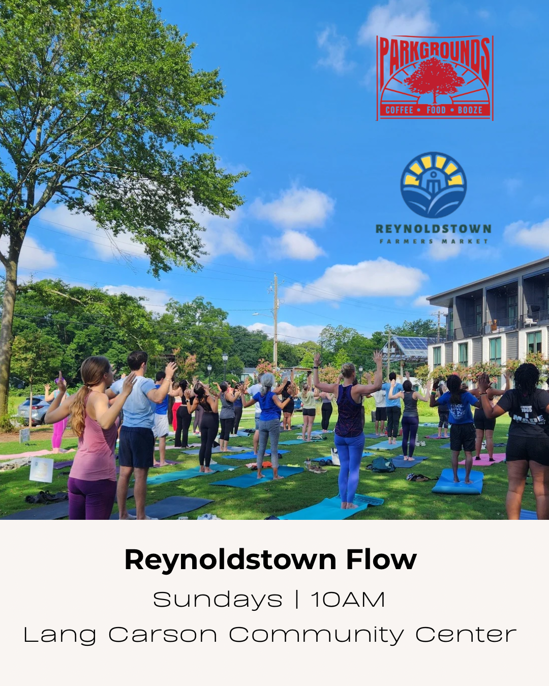 On sunny days, class takes place in Upper Lang-Carson Park. When it’s rainy or cold, we move inside the community center. After class, head to the Reynoldstown Farmer’s Market to grab groceries, coffee, or breakfast and spend time in the park. When the market is off season, join us at ParkGrounds instead. Come for the yoga, stay for the yap!
